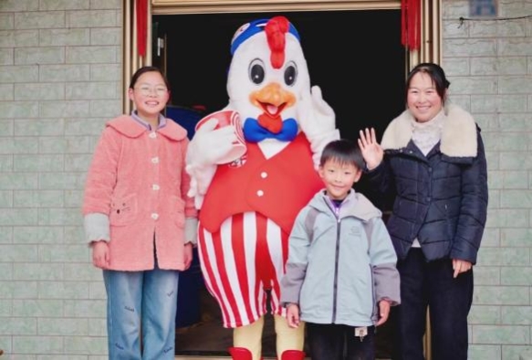 在湖南长沙外出务工五年的夏先生与妻子,心中也始终牵挂着远在安徽的儿女。在肯德基小候鸟基金的支持下,助力他们在今年春节,提前踏上了返回安徽老家的归程。到家前,夏先生精心扮成可爱的肯德基“奇奇”,妻子手捧着全家桶,当“小候鸟”看到这一幕时,先是惊讶地瞪大了双眼,仿佛不敢相信眼前的一切,紧接着便如归巢的鸟儿般扑进父母的怀里,紧密的拥抱弥补了长久缺失的陪伴与思念。一家人围坐在一起,吃着团圆的全家桶,系着温暖的亲子围巾,肯德基小候鸟基金在春节来临之际,为他们提供了温暖且难忘的团圆年。